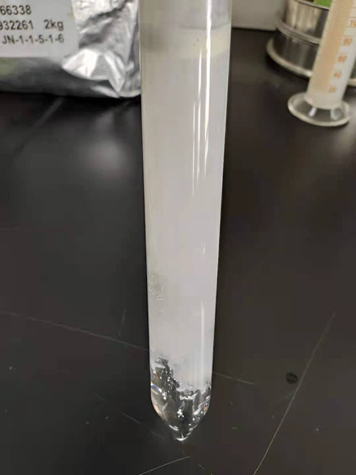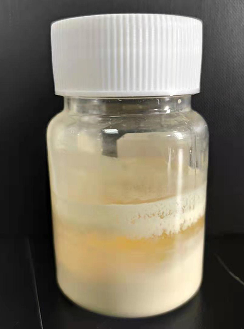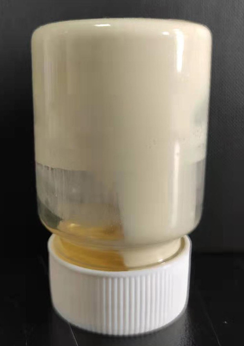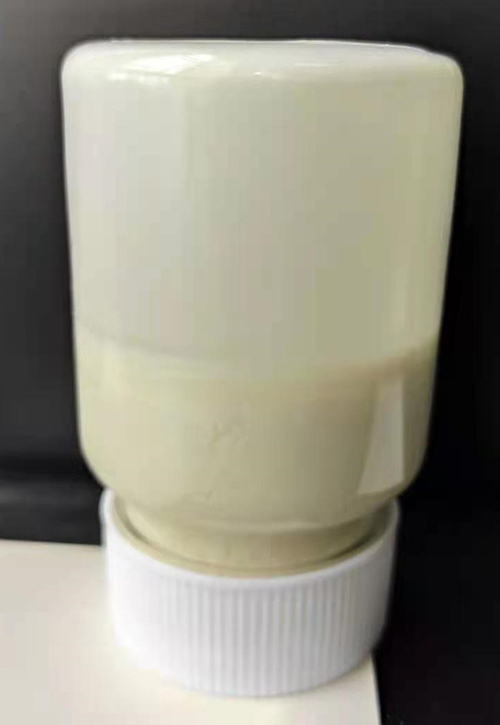 由于甲維鹽的獨特理化性質,甲維鹽單劑及其復配做成懸浮劑,甲維鹽含量在3%以下相對簡單,但甲維鹽含量超過3%,在加工過程中容易出現砂磨膏化(如圖1-1)、熱貯析水、結底膏化等現象(如圖1-2、圖1-3)。針對這一問題,我們通過對分散劑、潤濕劑進行大量試驗篩選,研發出一款針對甲維鹽及其復配制劑的專用助劑,牌號KY-SC15J,可解決此類問題,且助劑成本低、制劑穩定性好。