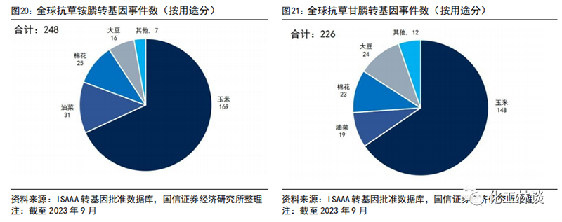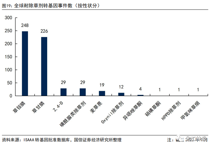 轉(zhuǎn)基因?qū)⒂行硬蒌@膦需求增長,有望成為未來 5 年第一大需求增長點。目前在轉(zhuǎn)基因領(lǐng)域草銨膦主要有四大需求:單抗草銨膦種子(主要為巴斯夫的耐草銨膦油菜種子和耐草銨膦大豆種子),大豆、棉花、玉米的雙抗/三抗種子。從全球主要農(nóng)業(yè)國轉(zhuǎn)基因推廣情況看,美國是全球最大的轉(zhuǎn)基因作物種植國,種植面積占全球的 39%,轉(zhuǎn)基因大豆、玉米和棉花的滲透率達(dá) 93%。根據(jù) Stratus Ag 的研究,美國將近 75%的種植者正面臨嚴(yán)重的草甘膦抗性雜草問題,且草甘膦致癌爭議不斷,此時草銨膦在除草譜寬度及對抗抗性雜草問題方面被置為首選。安徽中農(nóng)縱橫預(yù)測遠(yuǎn)期草銨膦耐性基因在美國大豆中的滲透率有望超過 50%,美國遠(yuǎn)期草銨膦需求量將在 1.4 萬-1.6 萬噸/年。加拿大是全球油菜的主要種植國家之一,種植面積占全球約 1/4,轉(zhuǎn)基因油菜滲透率達(dá) 95%,其中抗草銨膦轉(zhuǎn)基因油菜與抗草甘膦轉(zhuǎn)基因油菜的滲透率之比為 55%:45%,未來增減空間有限。阿根廷、巴西轉(zhuǎn)基因種植水平和美國類似,大豆、玉米、棉花等主要轉(zhuǎn)基因作物滲透率穩(wěn)定在92%以上,遠(yuǎn)期將增加約 7000 噸/年的草銨膦需求。目前 ISAAA 轉(zhuǎn)基因批準(zhǔn)數(shù)據(jù)庫收錄的抗草銨膦轉(zhuǎn)基因商品數(shù)量已經(jīng)超過抗草甘膦轉(zhuǎn)基因商品,同時巴斯夫、先正達(dá)等國際農(nóng)化巨頭耐草銨膦的轉(zhuǎn)基因大豆、玉米等品種正在美國、巴西等國家大面積推廣,預(yù)計轉(zhuǎn)基因領(lǐng)域可以給草銨膦帶來約 2-3 萬噸/年的增量需求。