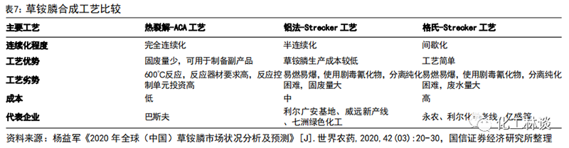 工藝對比:1)巴斯夫采用的熱裂解-ACA 工藝比較先進(jìn),三廢排放、合成成本最低,全流程可以采用連續(xù)化作業(yè),自動化程度高,總收率可以達(dá)到 95%左右;但是該工藝難度較大,對裝置的要求高。2)我國大部分草銨膦生產(chǎn)企業(yè)采用格式-Strecker 工藝,該工藝技術(shù)壁壘低,易于產(chǎn)業(yè)化,但缺點是該反應(yīng)需在高壓下進(jìn)行,易燃易爆安全隱患大,三廢排放多,且收率參差不一,收率只有 54%-70%;因此該工藝綜合成本較高,連續(xù)化程度也不高,環(huán)保和安全水平難以企及巴斯夫路線。3)鋁法-Strecker 工藝是從格式-Strecker 工藝向熱裂解-ACA 工藝過渡的工藝,該工藝設(shè)備投資較小,綜合成本較格式法低,但仍然存在固廢產(chǎn)生量大、反應(yīng)過程危險等問題。該法較格式法還有一個優(yōu)勢在于可以合成 MDP,從而后段又可以改為 ACA 工藝,MDP 還可以應(yīng)用于 L-高絲氨酸法合成 L-草銨膦。