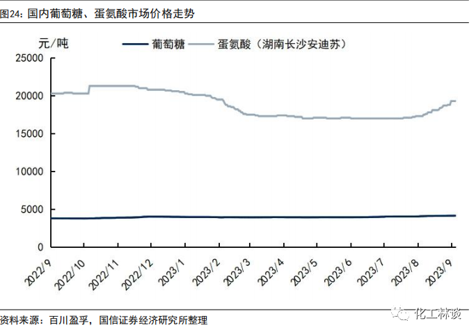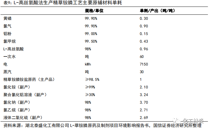 L-高絲氨酸法的關(guān)鍵在于 L-高絲氨酸、中間體的穩(wěn)定供應(yīng),技術(shù)成熟后成本優(yōu)勢將逐漸顯現(xiàn)。根據(jù)泰盛化工、匯盟生物等公司的相關(guān)項目環(huán)評公告及百川盈孚、wind 等平臺提供的相關(guān)原輔材料價格信息,我們測算出以葡萄糖為原料使用生物發(fā)酵法生產(chǎn) L-高絲氨酸的主要原輔材料成本約 1.1 萬元/噸。同時,根據(jù)湖北泰盛化工有限公司 L-草銨膦原藥及制劑項目環(huán)境影響報告書中 L-草銨膦的物料平衡表,剔除掉溶劑等重復(fù)使用的物料,我們測算出理論上 L-高絲氨酸法生產(chǎn)精草銨膦的主要原輔材料成本約 7-8 萬元/噸,而 L-高絲氨酸工藝的副產(chǎn)品如果全部外售也可帶來 1-2 萬元/噸的收入,沖抵部分生產(chǎn)成本。目前國內(nèi) L-高絲氨酸法精草銨膦尚實現(xiàn)工業(yè)化生產(chǎn),原因在于 L-高絲氨酸和中間體的供應(yīng)不穩(wěn)定以及工藝不夠成熟,我們認(rèn)為未來工藝成熟后 L-高絲氨酸法的成本優(yōu)勢將逐漸顯現(xiàn)。