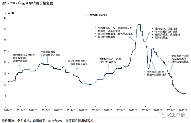 復(fù)盤近年來草銨膦價格走勢:2016 年下半年以來,國內(nèi)部分草銨膦小型企業(yè)生產(chǎn)成本與銷售價格倒掛,被迫停產(chǎn),疊加趨于嚴(yán)格的環(huán)保政策,草銨膦開工率驟降。同時由于草銨膦技術(shù)壁壘較高、工藝復(fù)雜、環(huán)境污染較重,2017 年國內(nèi)幾乎沒有新增草銨膦產(chǎn)能投放市場。供需矛盾推動草銨膦在 2017 年年底最高上調(diào)至 20.7萬元/噸,全年均價 17.39 萬元/噸。2017 年,隨著國內(nèi)百草枯水劑全面禁用,作為替代品的草銨膦需求快速增長,草甘膦復(fù)配制劑應(yīng)用增加以及抗草銨膦轉(zhuǎn)基因作物的推廣也拉動了草銨膦需求。2018 年,中國草銨膦新增產(chǎn)能集中釋放,市場整體貨源供應(yīng)較足,但下游消化能力有限,草銨膦價格基本保持下行走勢,2018年國內(nèi)草銨膦均價 17.99 萬元/噸。2019 年,部分廠家加速擴(kuò)產(chǎn),市場供應(yīng)能力不斷增強(qiáng)。國內(nèi)市場相對較為飽和,下游制劑庫存較多,商家購買力較弱。供大于求使得草銨膦價格在 2019 年年底跌至 10.3 萬元/噸,全年均價 12.74 萬元/噸。2020 年,受疫情影響,供應(yīng)草銨膦中間體企業(yè)階段性停產(chǎn),草銨膦生產(chǎn)企業(yè)開工率較低,市場貨源供應(yīng)緊張,草銨膦價格漲至 17.30 萬元/噸,全年均價 14.46萬元/噸。2021 年,中間體供應(yīng)能力一般,草銨膦整體開工負(fù)荷不高,市場貨源更為緊張。草甘膦價格持續(xù)上漲推動替代品草銨膦需求上升,9 月份原材料黃磷價格上行推動草銨膦價格一路上漲,原藥價格在 11 月末達(dá)到 37 萬元/噸的歷史最高價,全年均價也達(dá) 24.98 萬元/噸。2021 年 12 月開始,受供應(yīng)走高及下游對高價抵觸等因素影響,草銨膦價格進(jìn)入下行通道,至 2022 年 4 月上旬最低跌至 17.5萬元/噸,草銨膦價格在不到半年的時間內(nèi)較前期高點腰斬。4 月中旬開始,隨著外貿(mào)訂單不斷下發(fā),國內(nèi)需求啟動,草銨膦市場流通貨源緊張,價格再次走高,至 6 月上旬最高漲至 26.5 萬元/噸。2022 年 6 月開始,隨著國內(nèi)新增產(chǎn)能的陸續(xù)投放及爬坡,以及下游累庫接近尾聲,草銨膦行業(yè)進(jìn)入去庫周期,上游工廠庫存不斷走高,價格也隨之不斷下探,截至 2023 年 10 月 13 日,華東地區(qū)草銨膦價格跌至 6 萬元/噸,百川盈孚數(shù)據(jù)顯示當(dāng)前國內(nèi)草銨膦行業(yè)平均單噸虧損約1000-2000 元。