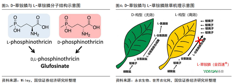 精草銨膦是草銨膦中的有效成分,可實現(xiàn)藥效翻倍、用量減半效果。草銨膦含有一個手性中心,具有 L 型和 D 型兩種光學(xué)異構(gòu)體,但只有 L 型具有除草活性,故L-草銨膦又稱精草銨膦。目前普通草銨膦農(nóng)藥多為 L-草銨膦和 D-草銨膦按照 1:1 比例組成的混合物,L-草銨膦的除草效果理論上為普通草銨膦的兩倍,但是在農(nóng)業(yè)實際運用過程中,L-草銨膦的除草效果約為普通草銨膦的 1.8 倍,L-草銨膦的市場價格約為普通草銨膦的 1.5-1.6 倍。L-草銨膦的推廣能夠降低 50%施藥量,可有效降低使用成本,未來全面推廣后全球每年可直接減排數(shù)萬噸 D-草銨膦無效體,有效減輕農(nóng)田耕作對環(huán)境造成的負(fù)擔(dān),符合國家農(nóng)藥減量增效政策。