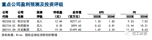 建議關(guān)注具有技術(shù)優(yōu)勢的普通草銨膦企業(yè)以及布局L-高絲氨酸法精草銨膦的企業(yè)。1)利爾化學(xué):現(xiàn)有精草銨膦產(chǎn)能2.3萬噸/年,另有13萬噸/年擬在建產(chǎn)能,產(chǎn)能規(guī)模全球最大,建設(shè)進(jìn)度領(lǐng)先行業(yè),且同時掌握生物酶催化法和L-高絲氨酸法,終端市場布局較早。2)利民股份:氣相連續(xù)法生產(chǎn)普通草銨膦具有技術(shù)優(yōu)勢,1萬噸/年精草銨膦一期項目預(yù)計年內(nèi)投產(chǎn)。3)興發(fā)集團(tuán):子公司規(guī)劃了5萬噸/年L-高絲氨酸法精草銨膦產(chǎn)能。