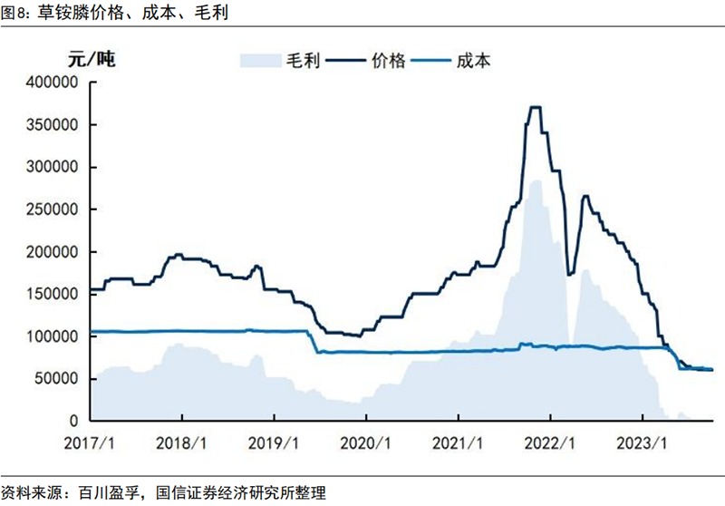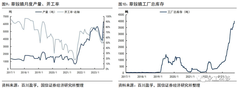 全球農(nóng)化行業(yè)去庫周期疊加新增產(chǎn)能陸續(xù)釋放,草銨膦價格大幅下調(diào),當(dāng)前行業(yè)盈利微薄,部分企業(yè)已虧。受過去兩年草銨膦價格大幅上漲、全球供應(yīng)和物流不暢、糧食安全日益得到各國重視等多因素影響,2022 年四季度以來各市場渠道中的備貨庫存走高,下游去庫壓力提升,相對應(yīng)的上游工廠庫存持續(xù)走高,截至 2023年 10 月初,國內(nèi)草銨膦工廠庫存已達(dá) 4000 噸,為自 2017 年以來的最高點,預(yù)計市場中的庫存消化仍將持續(xù)一段時間。在下游去庫的同時,草銨膦價格一路走跌,據(jù)百川盈孚,截至 2023 年 10 月 13 日,國內(nèi)草銨膦原藥價格跌至 6 萬元/噸,而同期行業(yè)平均成本則約 6.1-6.2 萬元/噸,技術(shù)相對落后的企業(yè)已經(jīng)出現(xiàn)小幅虧損。受草銨膦價格走跌影響,今年以來國內(nèi)工廠多選擇降低開工負(fù)荷,7 月份國內(nèi)草銨膦行業(yè)開工率降至 49.03%,為 2022 年以來的最低點;8、9 月份受新增產(chǎn)能釋放及季節(jié)性需求旺季影響,國內(nèi)草銨膦行業(yè)開工率分別回升至 66.37%、63.5%。總的來說,目前草銨膦仍處于供應(yīng)過剩、企業(yè)競爭階段,且新增產(chǎn)能還未完全釋放,推漲動力不足,但考慮成本端因素,預(yù)計草銨膦價格繼續(xù)下跌空間有限。與草銨膦相比,當(dāng)前精草銨膦市場售價約 10.3-10.5 萬元/噸,仍有 2-3 萬元的單噸毛利潤,因此從盈利角度看,開發(fā)精草銨膦也是行業(yè)的發(fā)展趨勢。