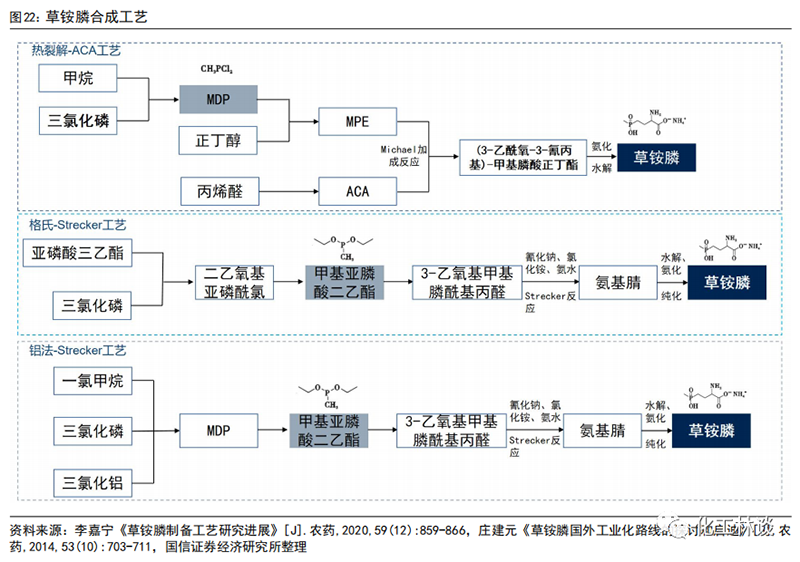 草銨膦生產(chǎn)工藝壁壘較高,目前全球草銨膦主要有 3 種產(chǎn)業(yè)化生產(chǎn)路線:熱裂解-ACA 工藝、鋁法-Strecker 工藝、格氏-Strecker 工藝。理論上,草銨膦可經(jīng)由化學(xué)合成法和生物發(fā)酵法提取,目前各種合成方法各有優(yōu)劣,但總體都面臨反應(yīng)條件要求高、工藝復(fù)雜、過程控制難度大、成本較高等問題,目前國內(nèi)僅有少部分公司的能實現(xiàn)規(guī)模化穩(wěn)定生產(chǎn)。當(dāng)前,全球草銨膦的生產(chǎn)工藝包括熱裂解-ACA工藝、鋁法-Strecker 工藝和格氏-Strecker 工藝三種,三種方法有其相似之處,但在原材料成本、過程損耗、反應(yīng)機(jī)理、環(huán)保友好性和收率等方面區(qū)別較大。
